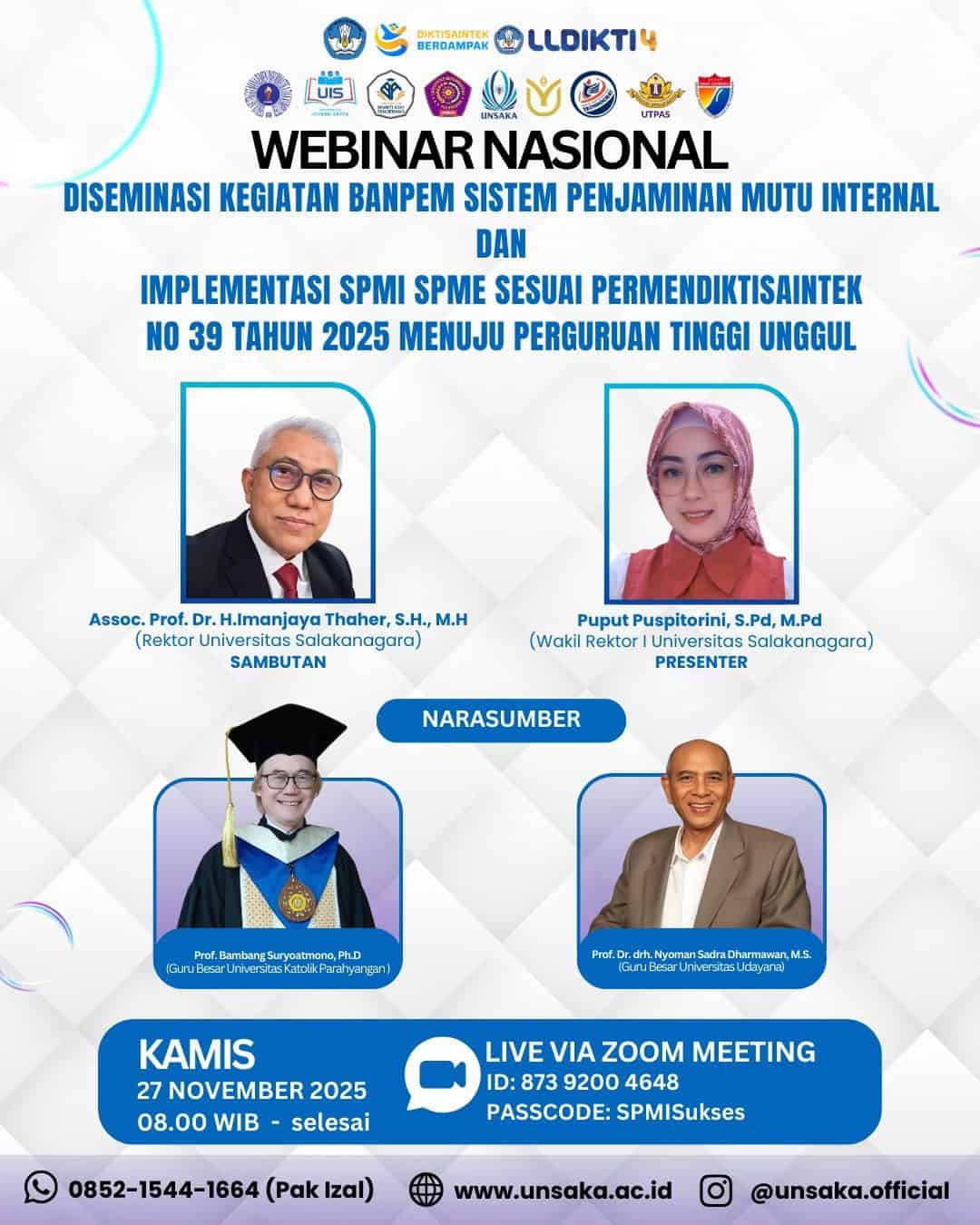 Universitas Medika Suherman (UMEDS) melalui perwakilan Ketua LPMI, Gugus Kendali Mutu (GKM), dan Unit Mutu menghadiri Webinar Nasional SPMI Perguruan Tinggi yang diselenggarakan oleh Universitas Salakanagara (UNSAKA) pada Kamis, 27 November 2025 secara virtual melalui platform Zoom Meeting dan disiarkan langsung via YouTube.